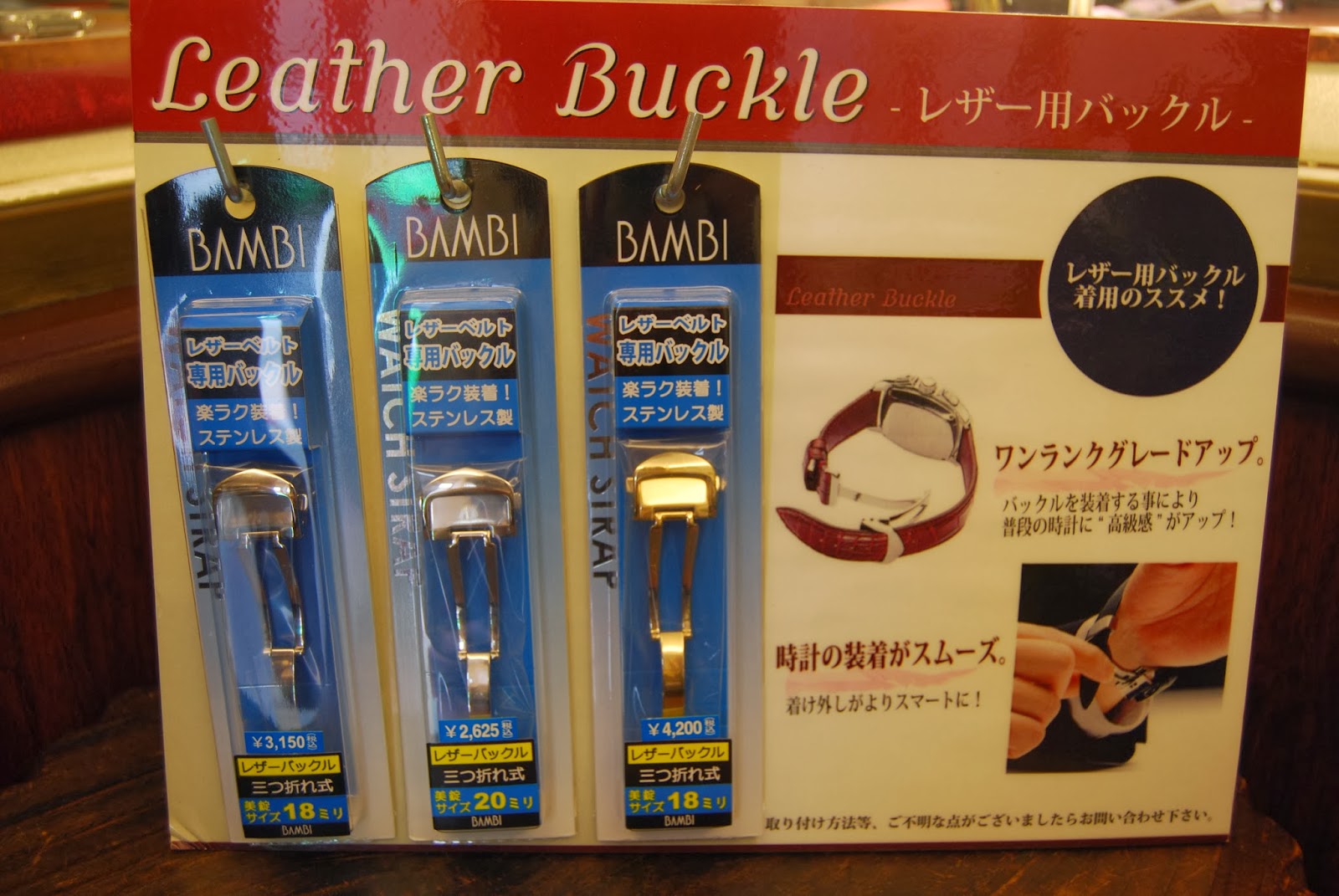 今日のご紹介はバンドレザーバックルです。写真は三つ折プッシュバックルでこれを