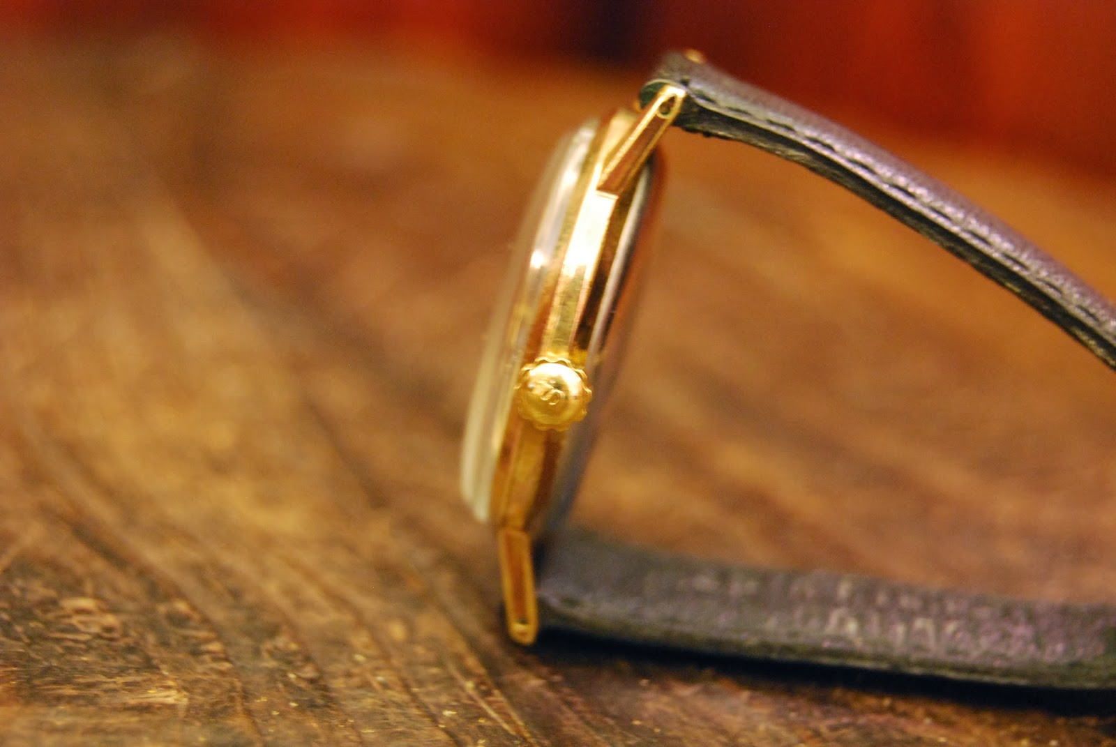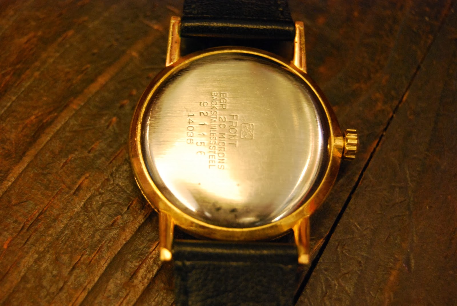 黒文字盤の金色ケース、金色インデックスはこの配色は舶来時計に多く国産は少な