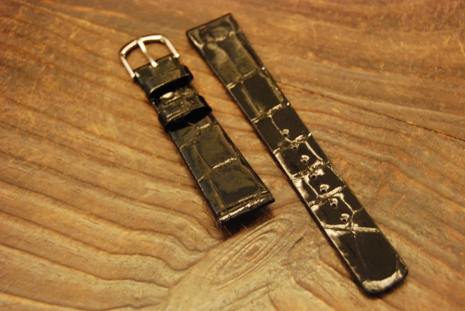 今日のご紹介は黒クロコ{ワニ}バンドです。尾錠はステンレス尾錠を採用しており