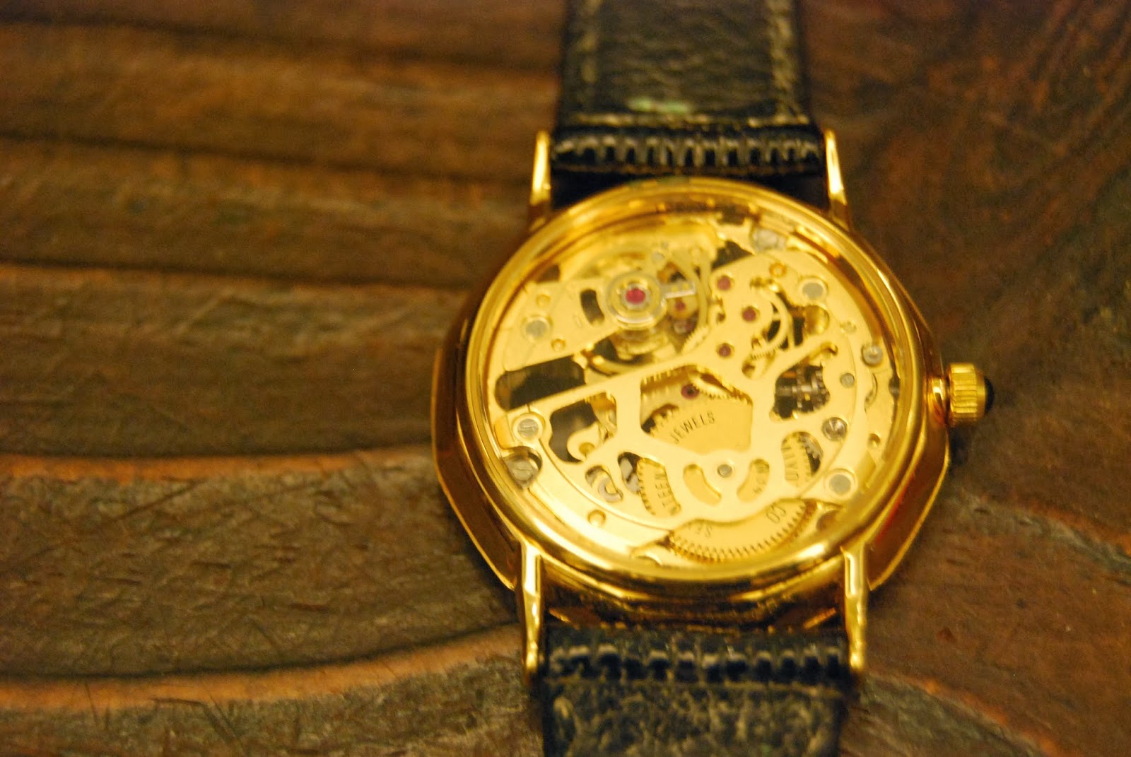 このフルスケルトン腕時計は文字盤のインデックスに人口ルビーを配置したかなり