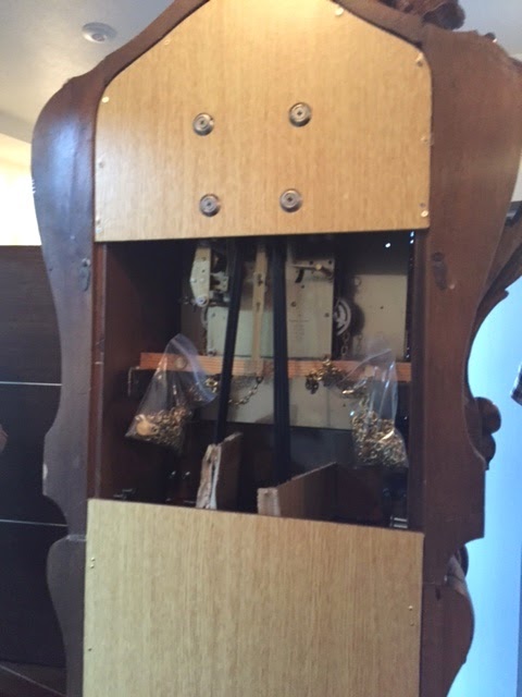 破損の為別作④重り用チェーン1本不足により別作⑤木製本体の前扉破損のため修復、ガラス取り付け⑥